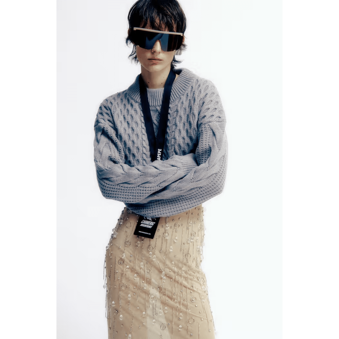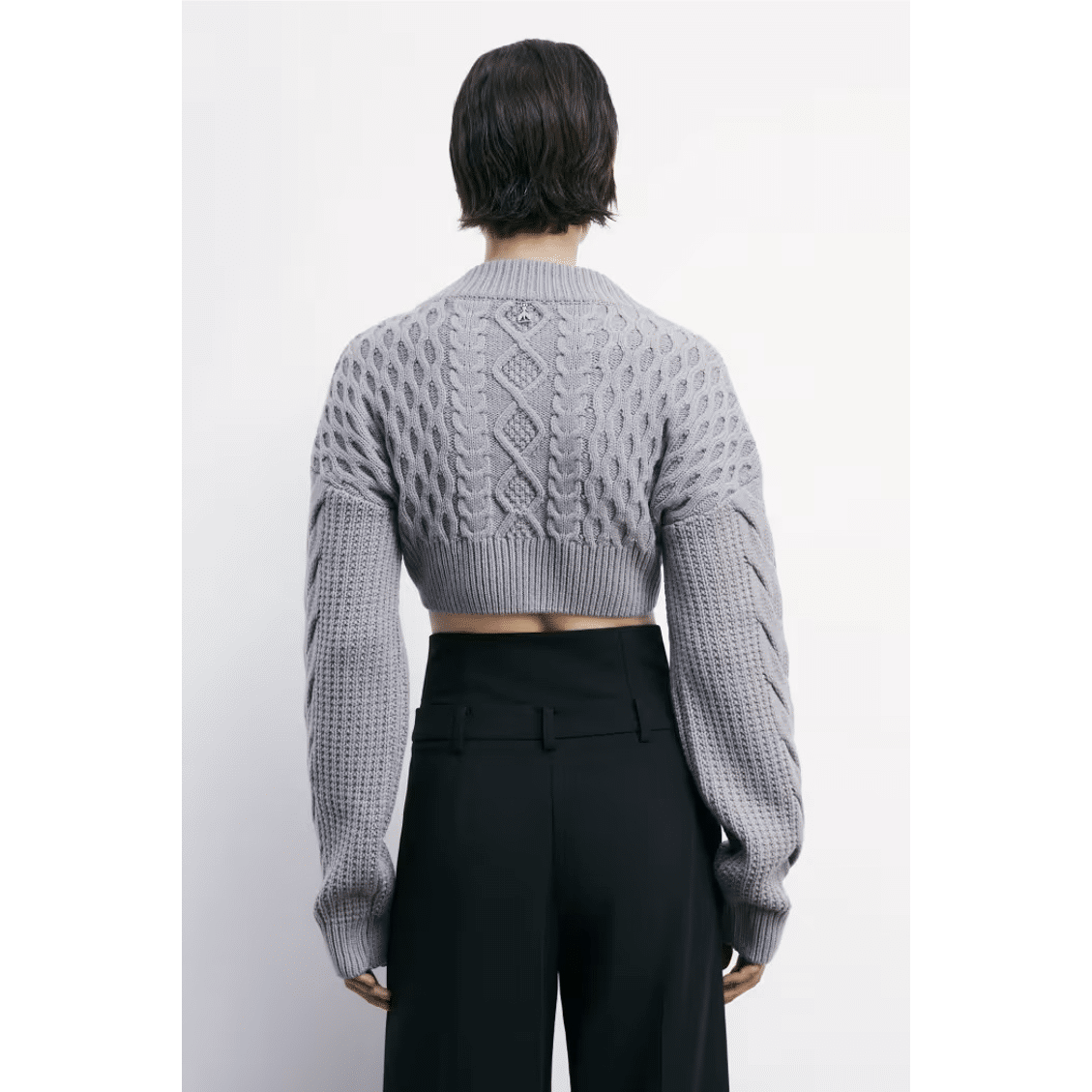 Kurzer Pullover aus Wollmischstrick mit aufwendigen Strickdetails. Weich und wärmend, betont er Schultern und Taille – perfekt für lässige Off-Duty-Looks in Kombination mit weit geschnittenen Low-Waist-Hosen.