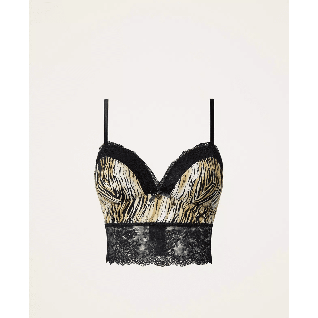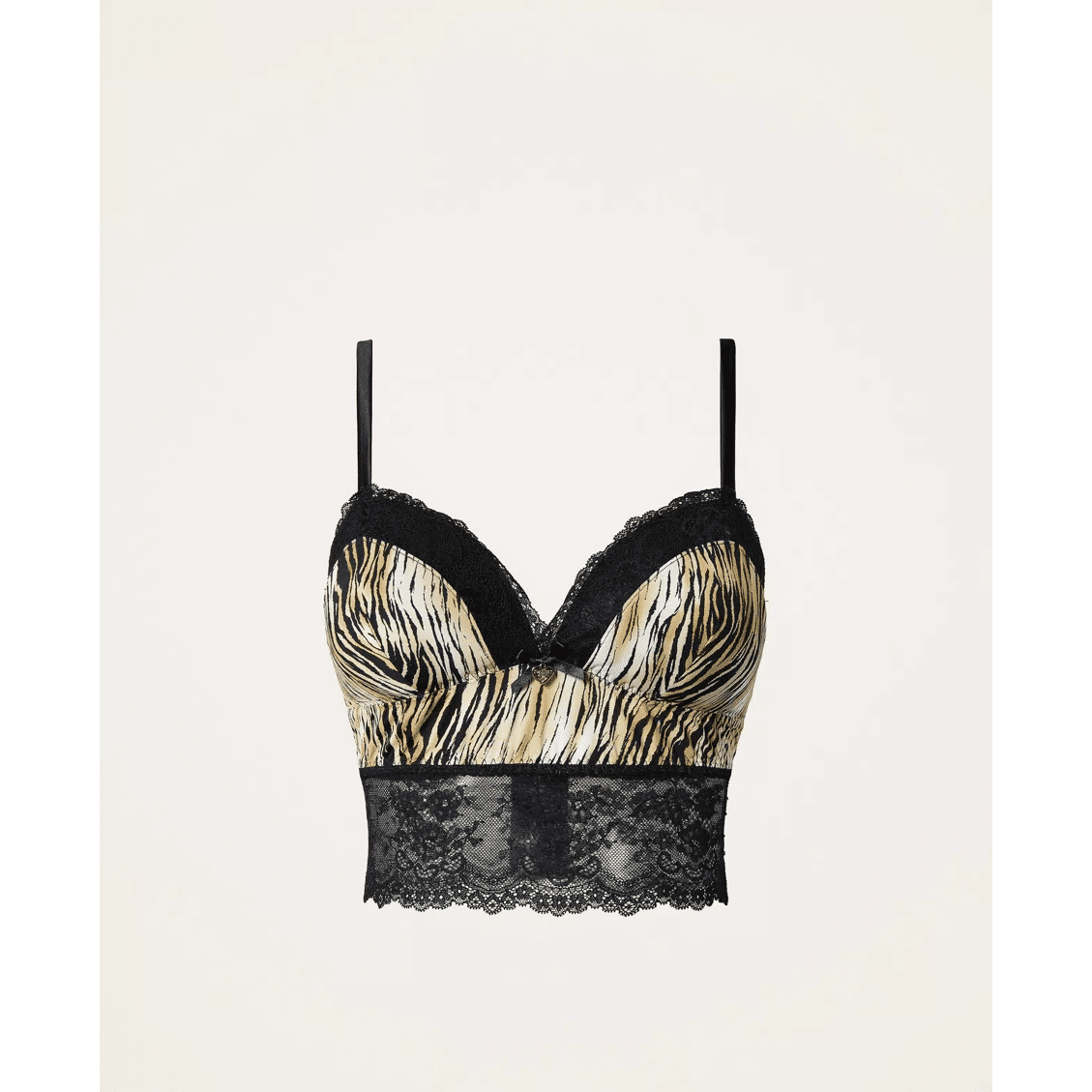 Don't miss the padded triangle bustier with non-removable cups, made from printed stretch satin with a sheer scalloped lace edge. It features adjustable straps that are covered at the front and made from elastic with a jacquard logo on the back, hook closure. Perfect also under blazers and cardigans. From size 3 and up, 'C' cup bras have wider straps for better comfort and fit.