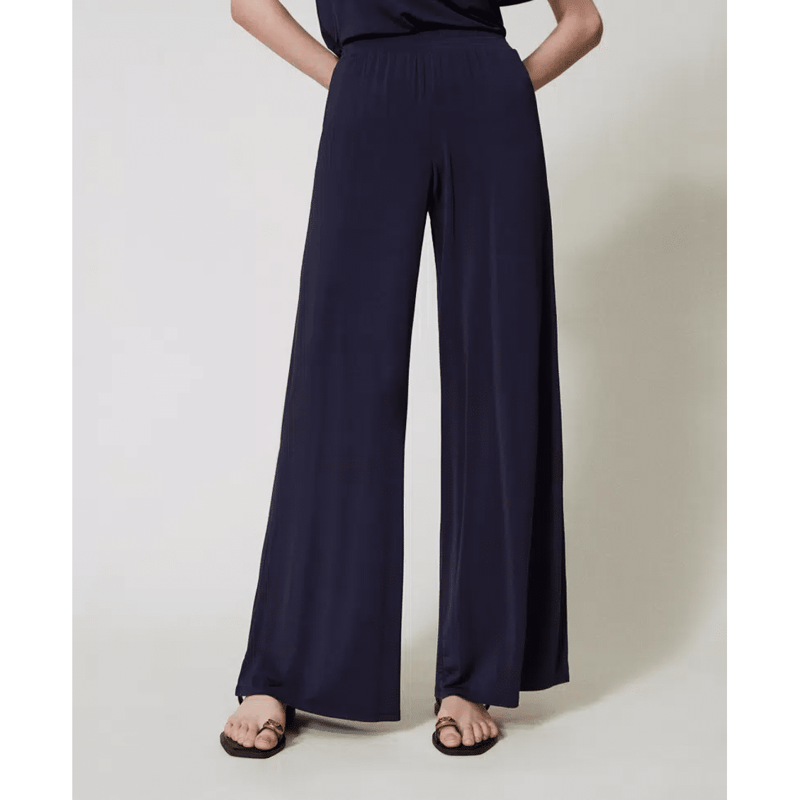 Laminated georgette trousers with elasticated waist and drawstring with metal ends, crêpe de Chine lining shorts, heart-shaped logo on the back, flared fit.