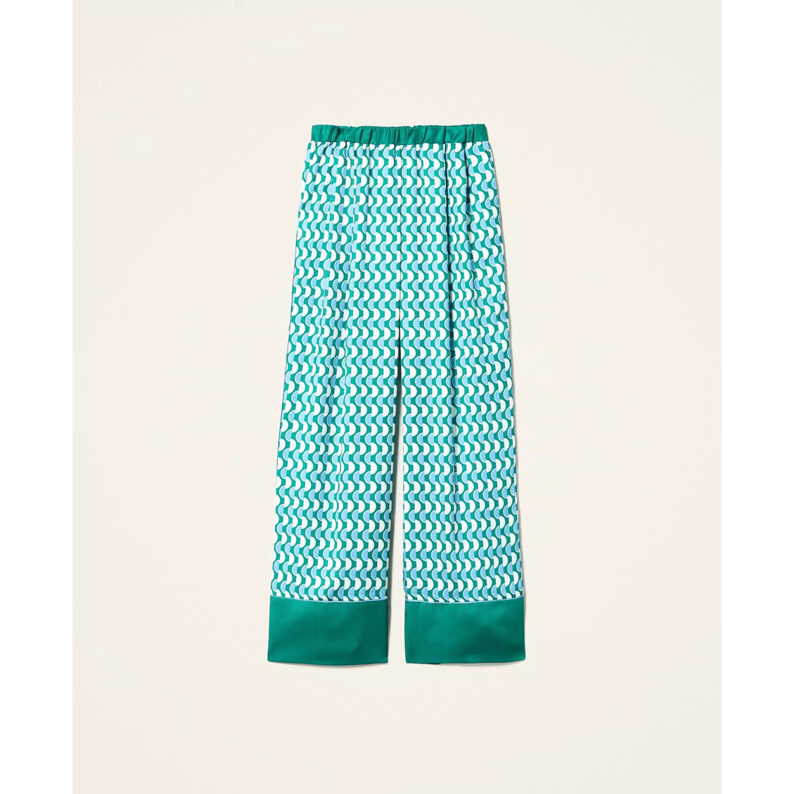 Satin palazzo pants with print, piping at hem, side pockets, solid color details.