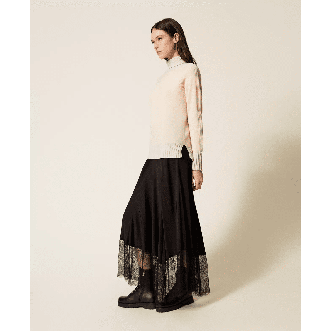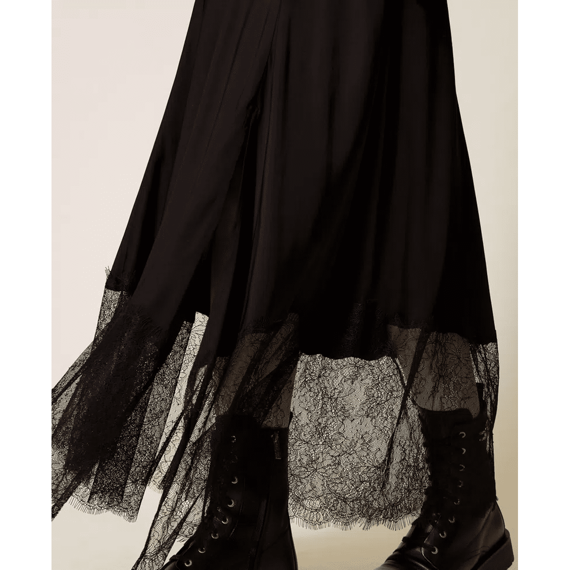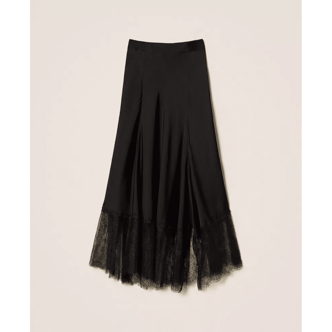 Schuine midirok van viscose satijn met doorschijnend geschulpt kant aan de zoom. Elastische taille, verborgen klittenbandsluiting aan de zijkant, zijsplit, hartvormig metalen logoplaatje op de rug, rechte pasvorm.