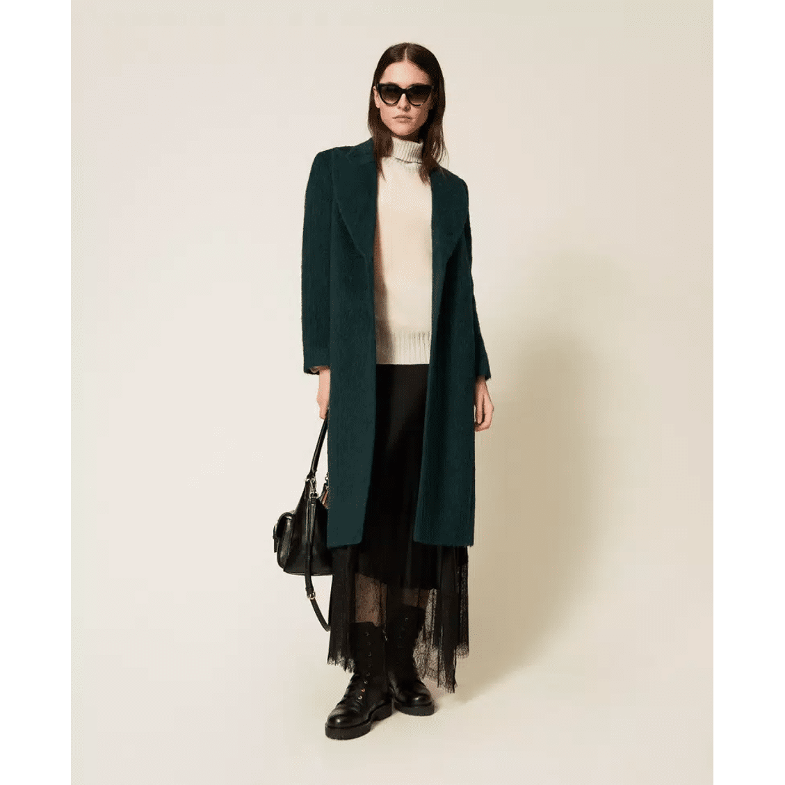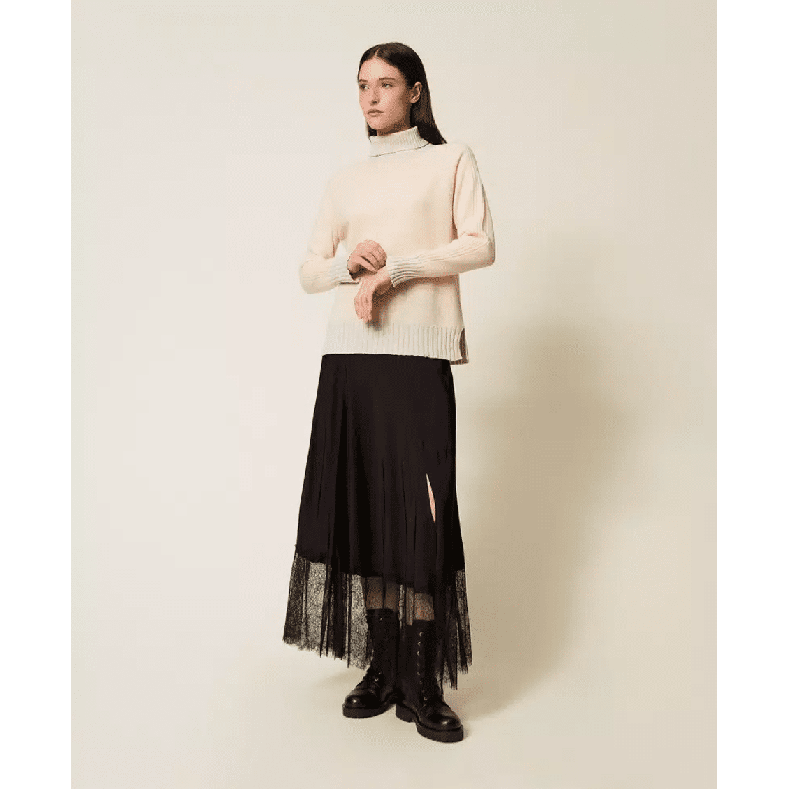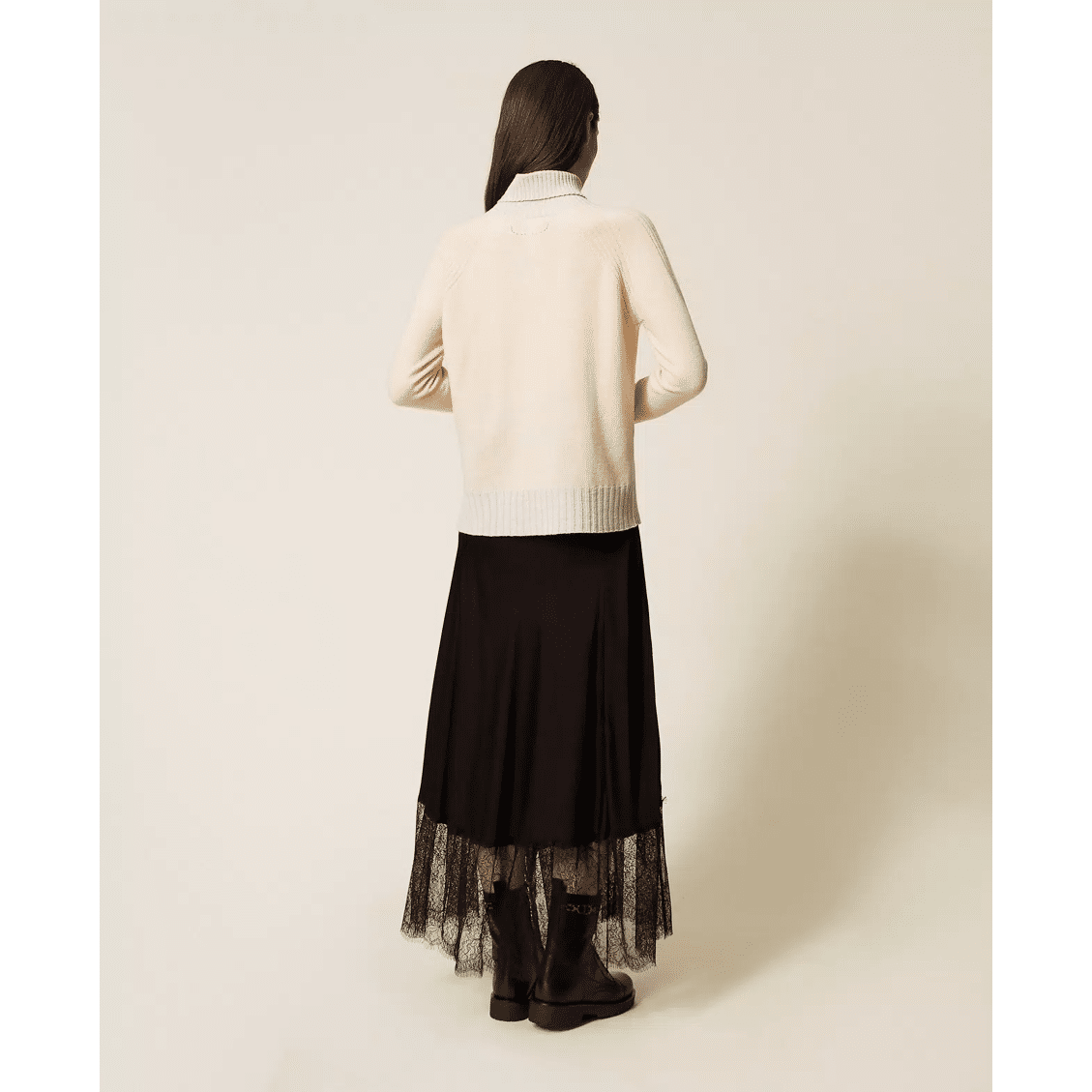 Schuine midirok van viscose satijn met doorschijnend geschulpt kant aan de zoom. Elastische taille, verborgen klittenbandsluiting aan de zijkant, zijsplit, hartvormig metalen logoplaatje op de rug, rechte pasvorm.